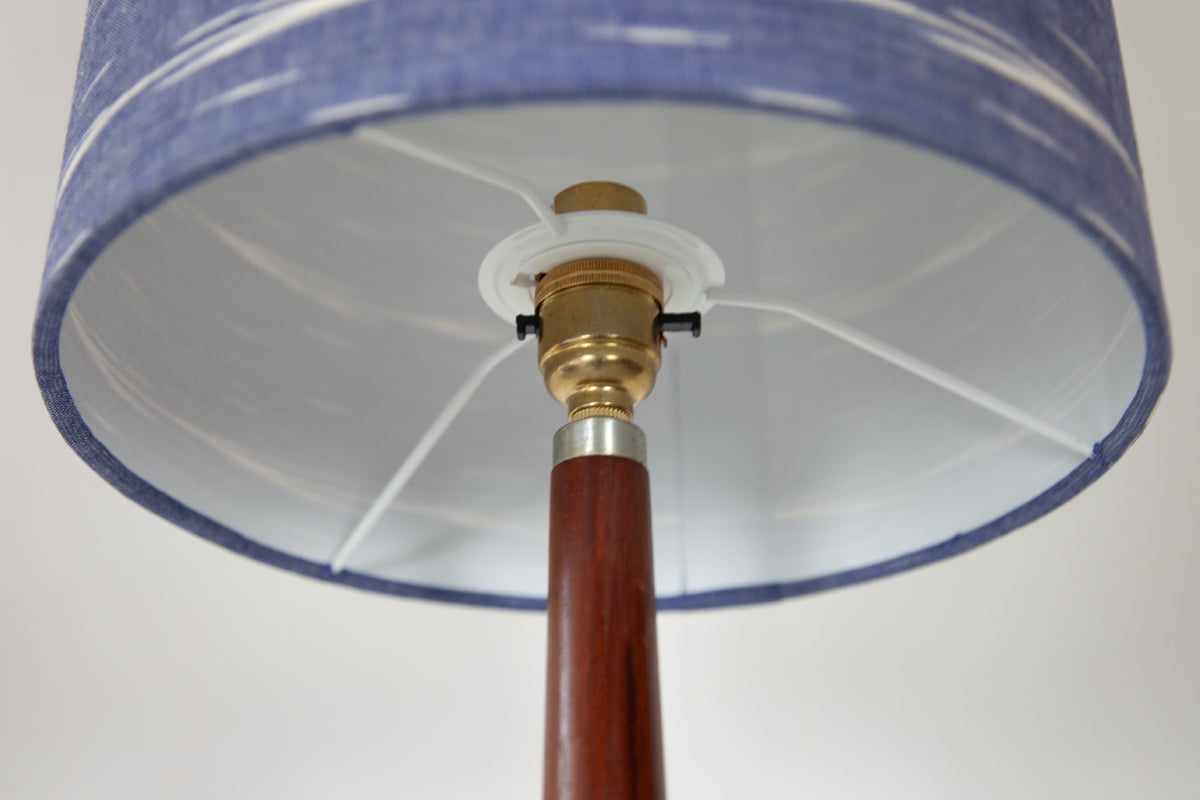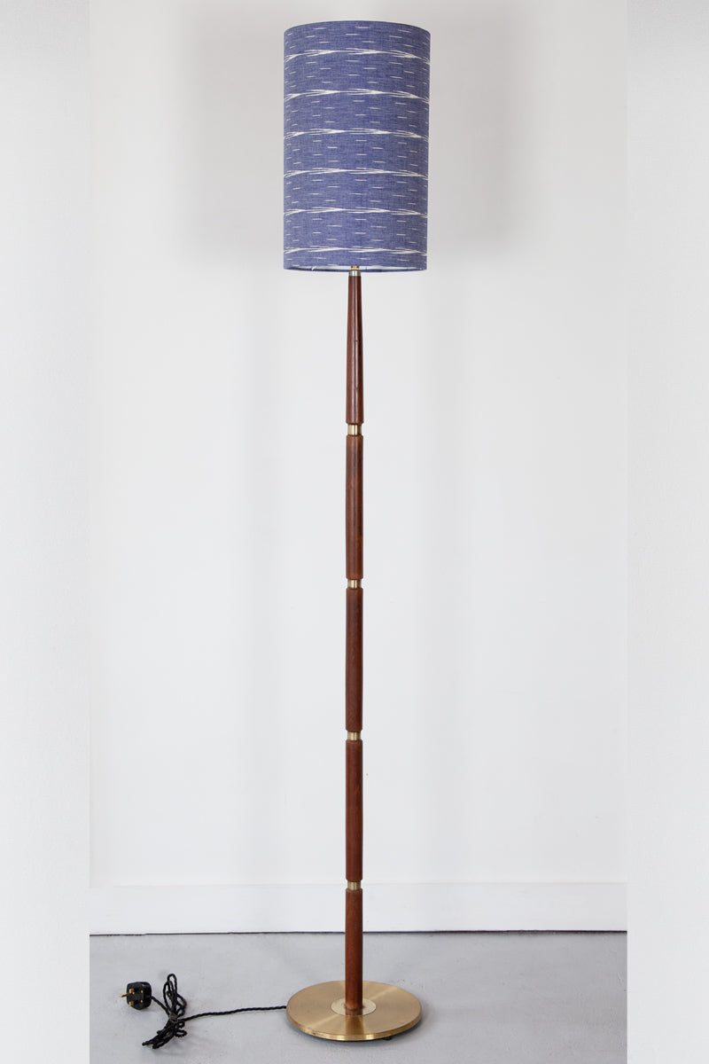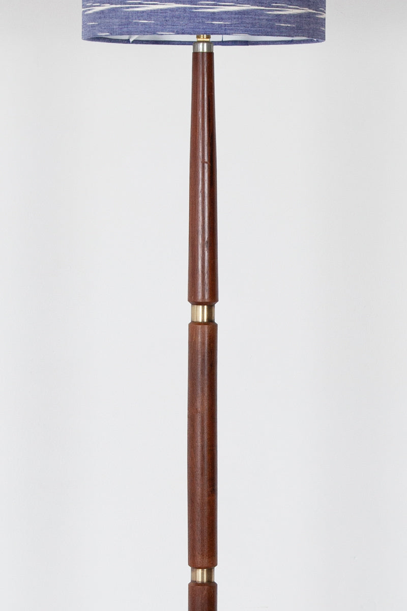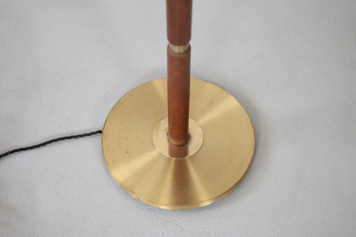 A minimalist Danish floor lamp with an elegant teak stem and brass detailing with an elegant brass base.