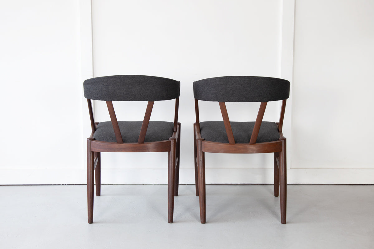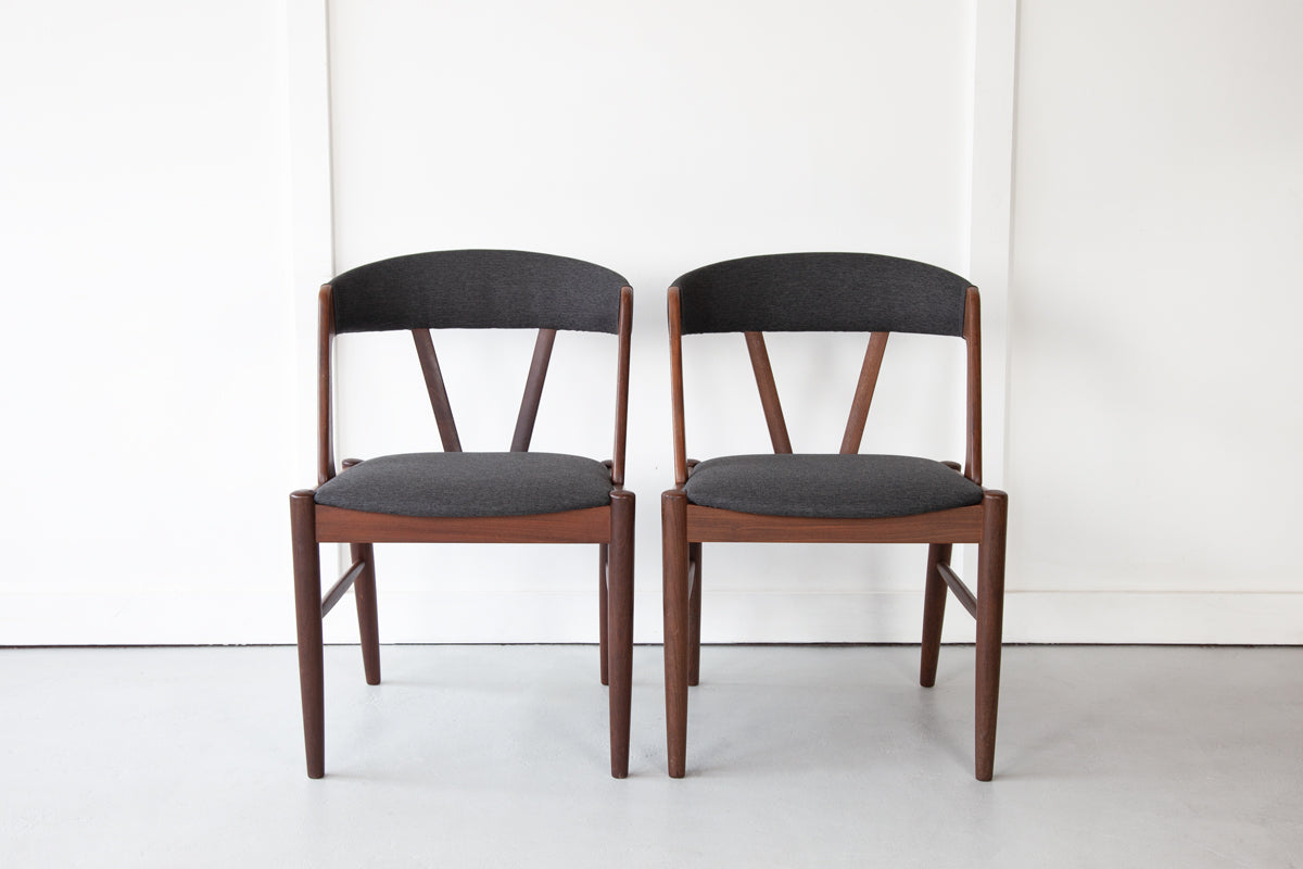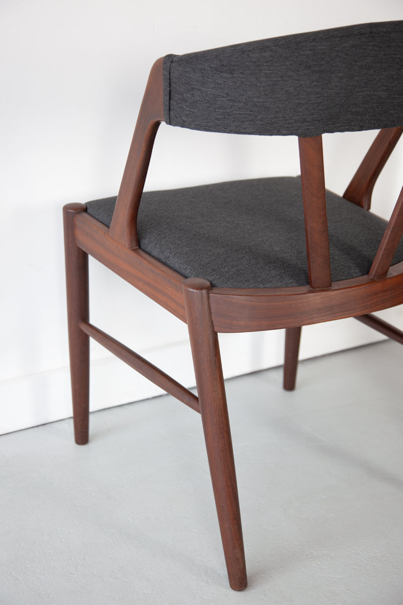 A pair of rare Danish carver chairs, attributed to Hans Hovmand Olsen, in the style of Kai Kristiansen's 'Model 31' chairs with an added 'wishbone' detailing to the backs. The chairs have solid teak frames and have been newly upholstered in a charcoal linen.