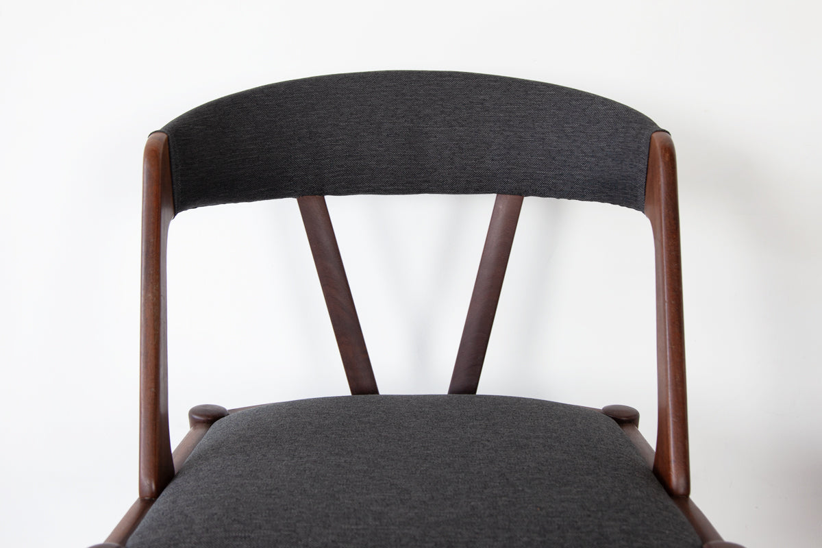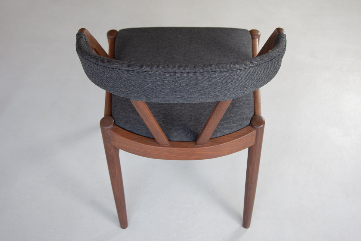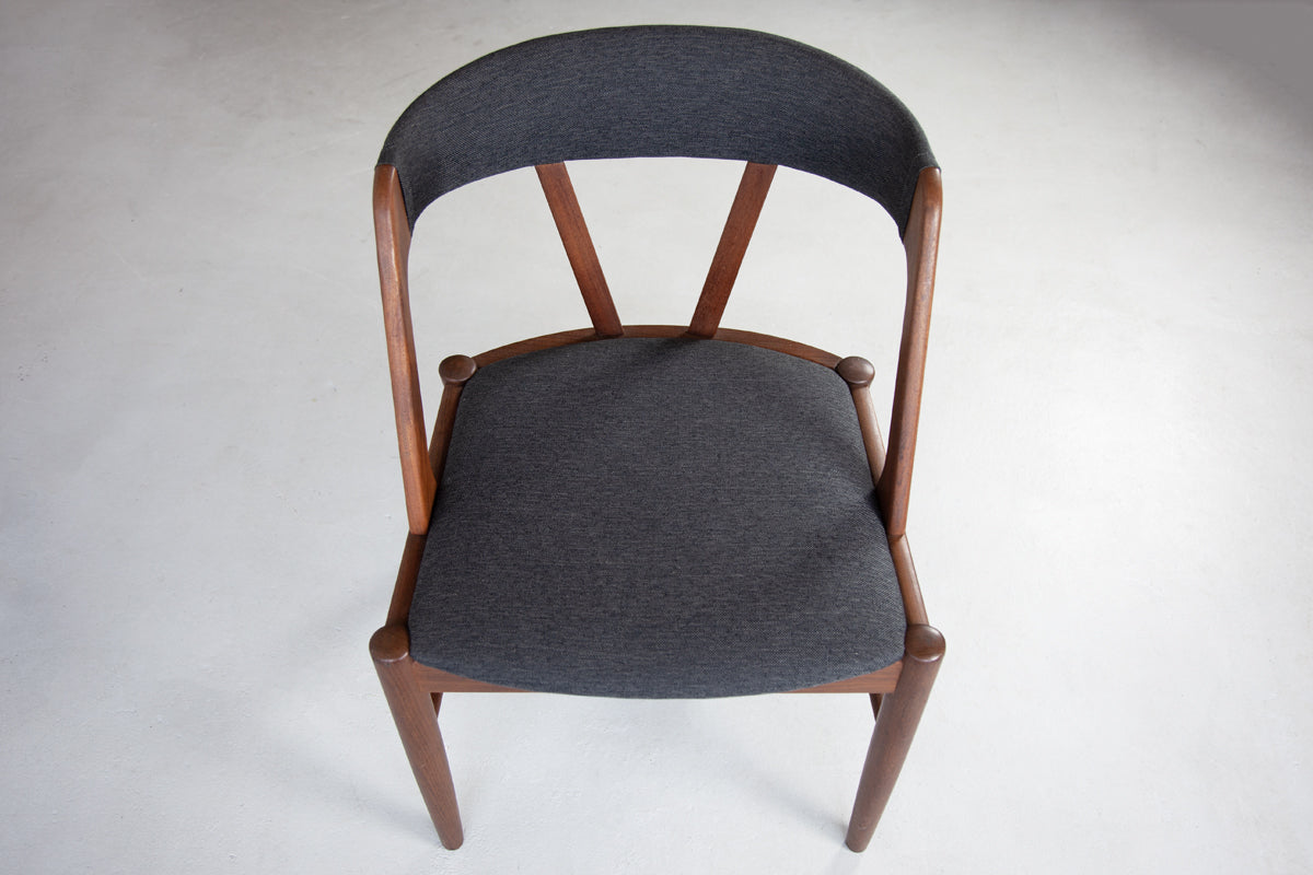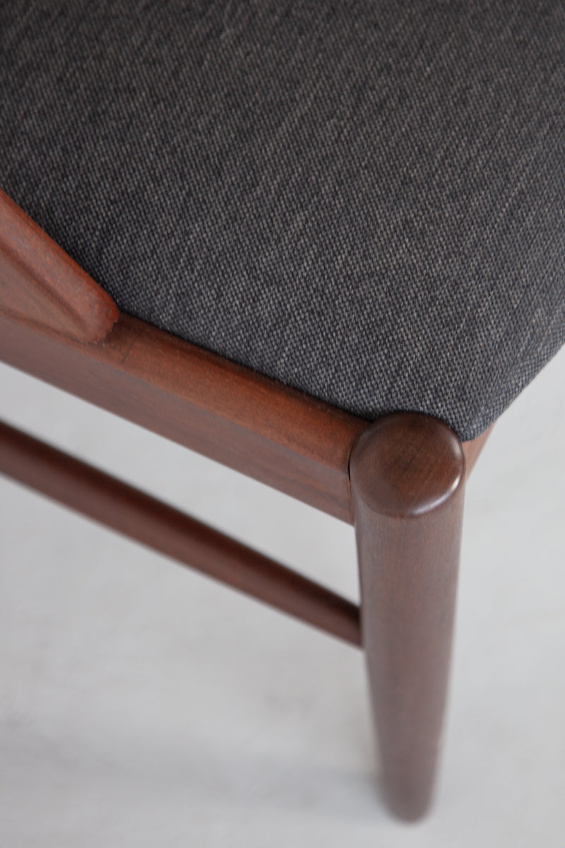 A pair of rare Danish carver chairs, attributed to Hans Hovmand Olsen, in the style of Kai Kristiansen's 'Model 31' chairs with an added 'wishbone' detailing to the backs. The chairs have solid teak frames and have been newly upholstered in a charcoal linen.
