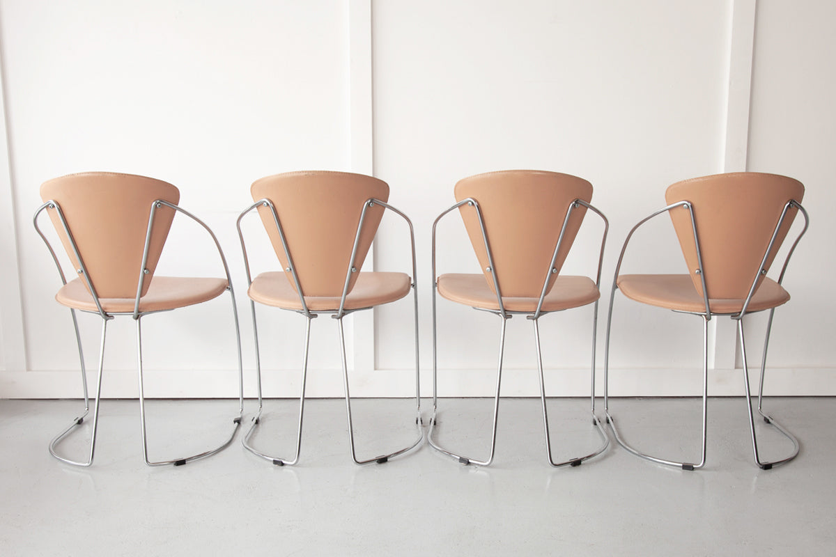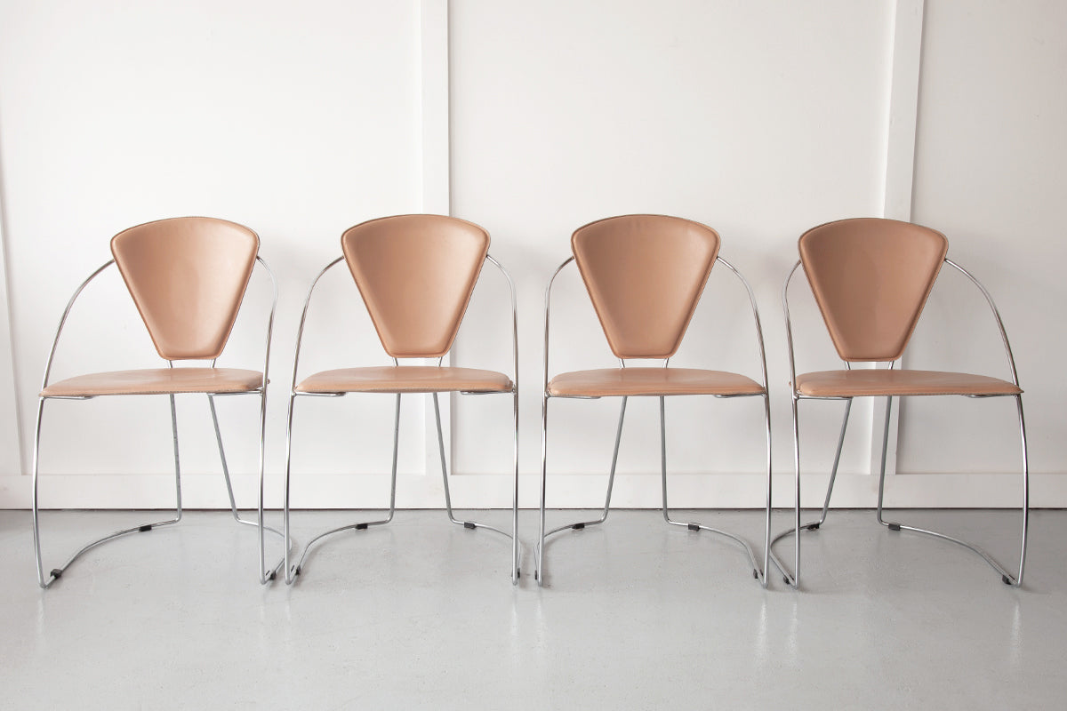 A set of four, stylish post-modern 'Linda' dining chairs, produced by Italian furniture makers, Arrben. Natural leather covers the seat and back rests with a beautifully slender, curing metal frame. A truly stand-out set of dining chairs which are not only aesthetically very beautiful, but also extremely comfortable.