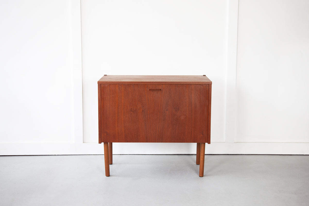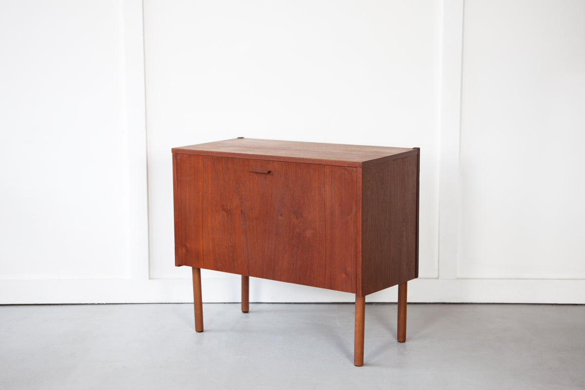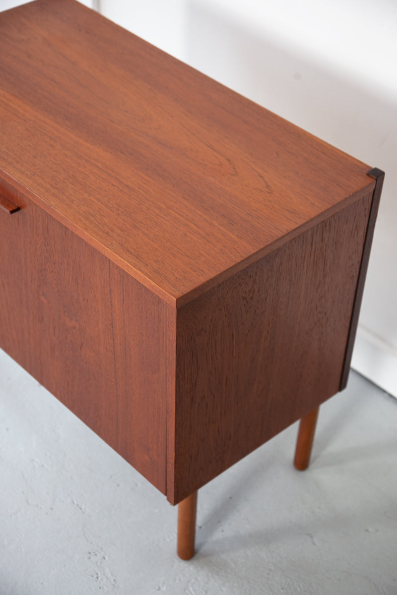 A very sweet and petit teak cabinet from Denmark with a hinged door which opens to reveal an open stroage comparment. Ideally sized for use as a media unit. The cabinet has two holes in the backboard which will have been created by a previous owner, mostly likely for wires to come through.